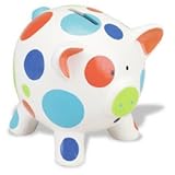 First, shame on me for not reading the complete description. I did not realize this was a paint-your-own bank. I thought I was buying a polka dot design. The brush and paints were very poor quality, not easy for a young child to use. I had to trim the brush and pick some bristles out of the paint. As a previous review states, the paint colors are not the colors shown on the package. I will use my own varnish as well because one small pot will not cover the entire bank. If you are crafty and have your own supplies, this is an economical choice. Otherwise, spend a little more for a finished product.Get more detail about Janlynn Piggy Bank.